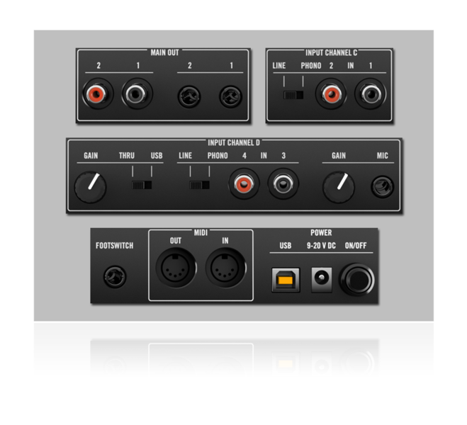 - Zwei analoge Eingänge mit Phono- und Mikrofon-Vorverstärkern zum Anschluss von Turntables, CD-Playern oder externem Audio-Equipment; RCA Mic-Eingang, Stereo-Klinke- und Cinch-Master-Outputs